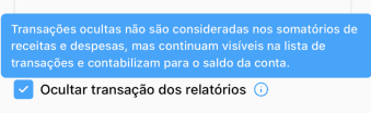 Por padrão, transferências entre contas ficam marcadas como ocultas dos relatórios.