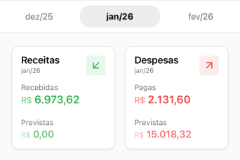 Você pode navegar entre os meses para ver o histórico ou acompanhar períodos futuros.