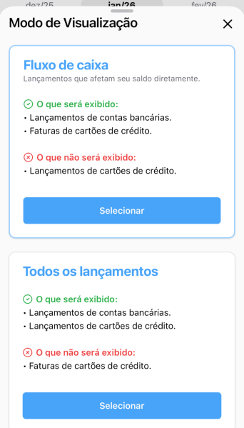 Diferença entre os modos de visualização “Fluxo de caixa” e “Todos os lançamentos”